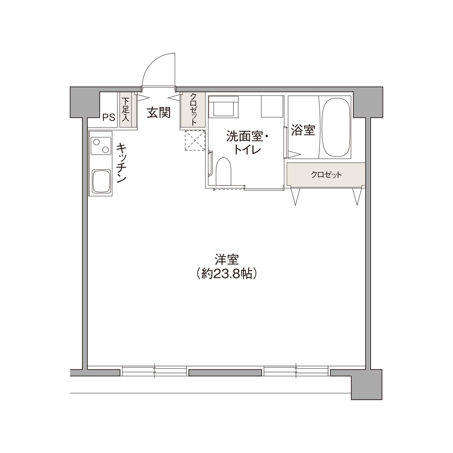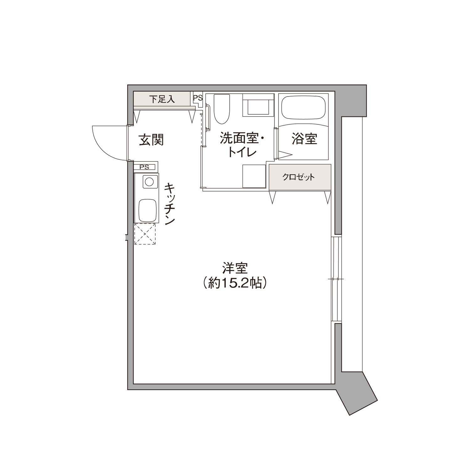 一人暮らしにゆとりと快適さを提供する約15.2帖の広々とした空間のワンルームプラン。 アウトポール設計により、家具のレイアウトも自由自在。 シューズキャビネットやクローゼットなど、必要な収納スペースも十分です。