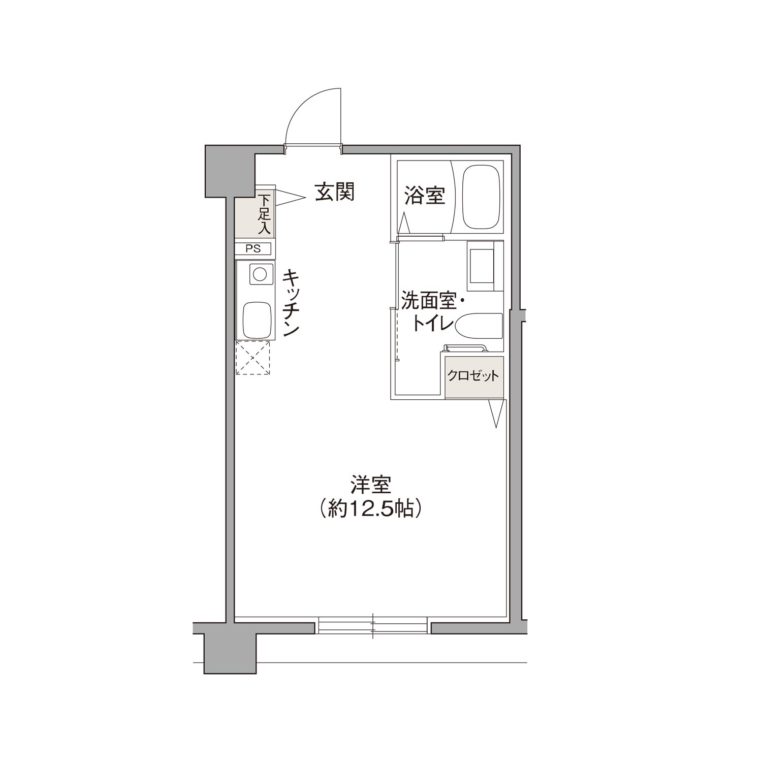 約12.5帖の広さは快適で充実した一人暮らしを楽しめるワンルームプラン。アウトポール設計が採用されているため、家具のレイアウトが自由自在。シューズキャビネットやクローゼットなど、十分な収納スペースも備えています。