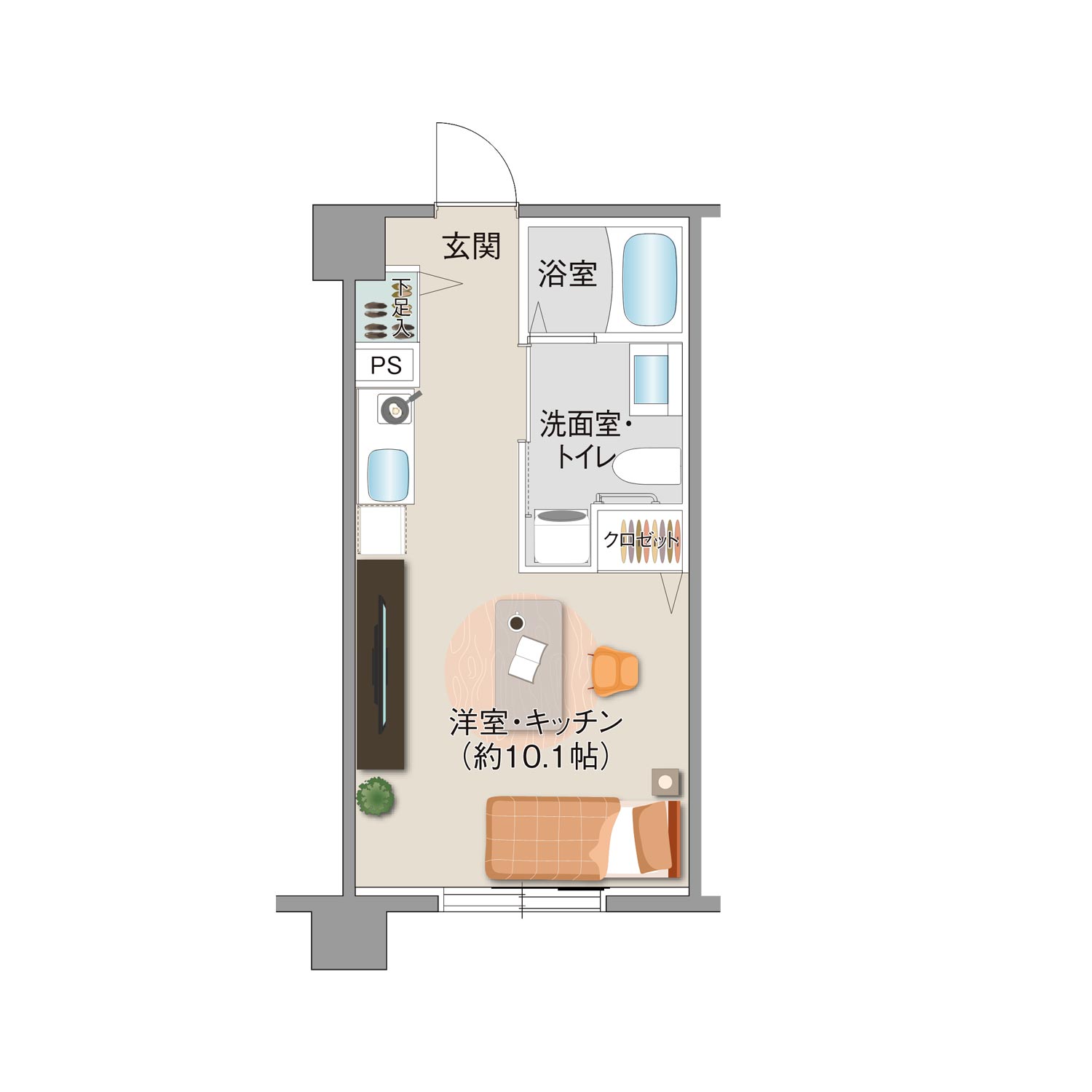 一人暮らしに適したゆとりある約10.1帖のワンルームプラン。 日常生活を考慮した機能的な動線設計が施され、室内に柱型の出ないアウトポール設計で家具の配置がスムーズ。 シューズキャビネットやクロゼットなど、必要な収納スペースも充実。
